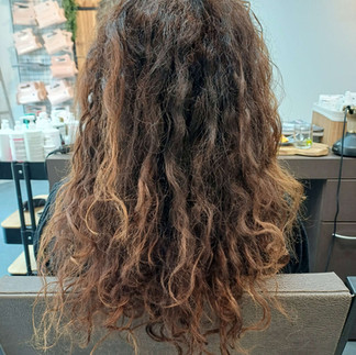 eerst een basis snit, dan een Curlsys of CC cutting krullensnit het spoelen van de haren en het drogen met een diffuser.